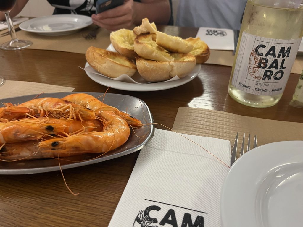 Na minha visita, gambas e francesinhas para três pessoas, pagámos 48 euros, incluindo uma botelha do vinho da casa, engarrafado pela Seacampo, um Dão jovem que, só não o é, porque não o enviaram à Câmara de Provadores, e a justiça manda que se mantenha o vinho na circunscrição. Seja como for, e é pormenor nada despiciendo, a mesa do Cambalro reflete a generosidade da mesa portuguesa.