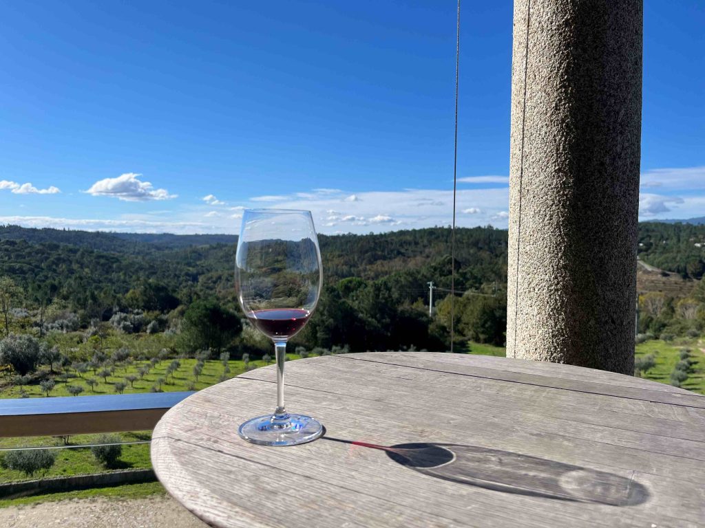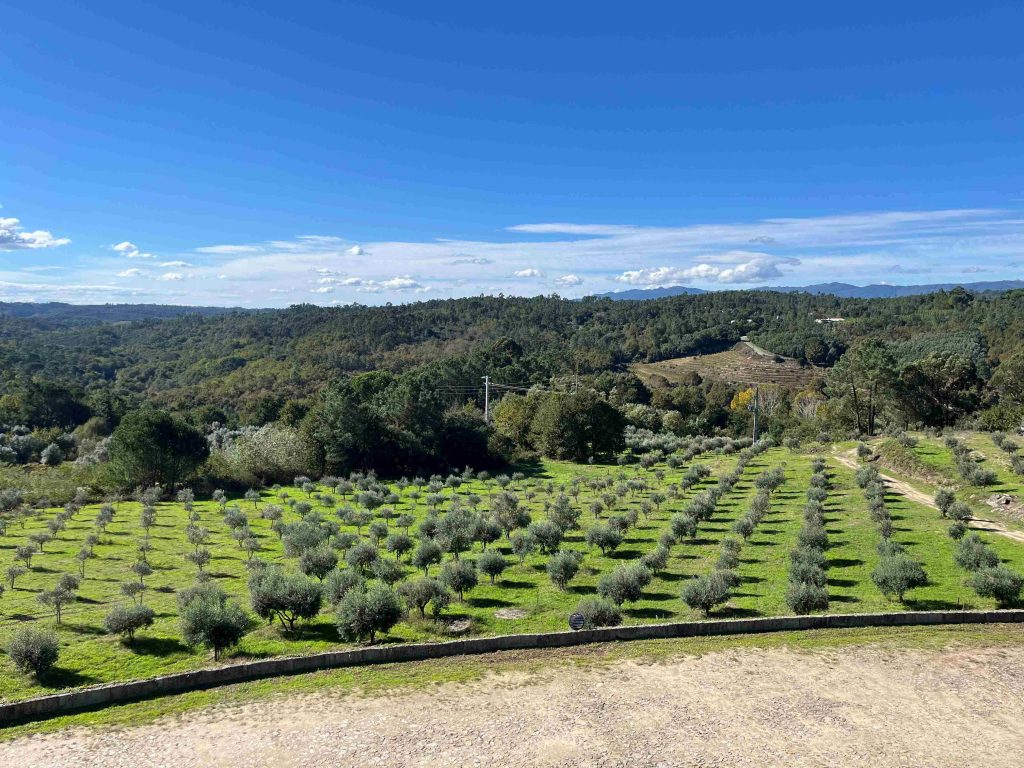 Primeiro, surgem as oliveiras. Sentinelas prateadas, de troncos retorcidos pelo tempo, que guardam o silêncio da Beira Alta. Elas balançam ao sabor do vento, oferecendo aquele verde-seco que define a paleta de cores da região. Depois, o horizonte abre-se e rendemo-nos aos vinhedos. Fileiras geométricas de videiras que desenham linhas infinitas, guiando-nos até ao coração da Quinta. É um mar de socalcos suaves onde o vinho do Dão nasce e ganha corpo.